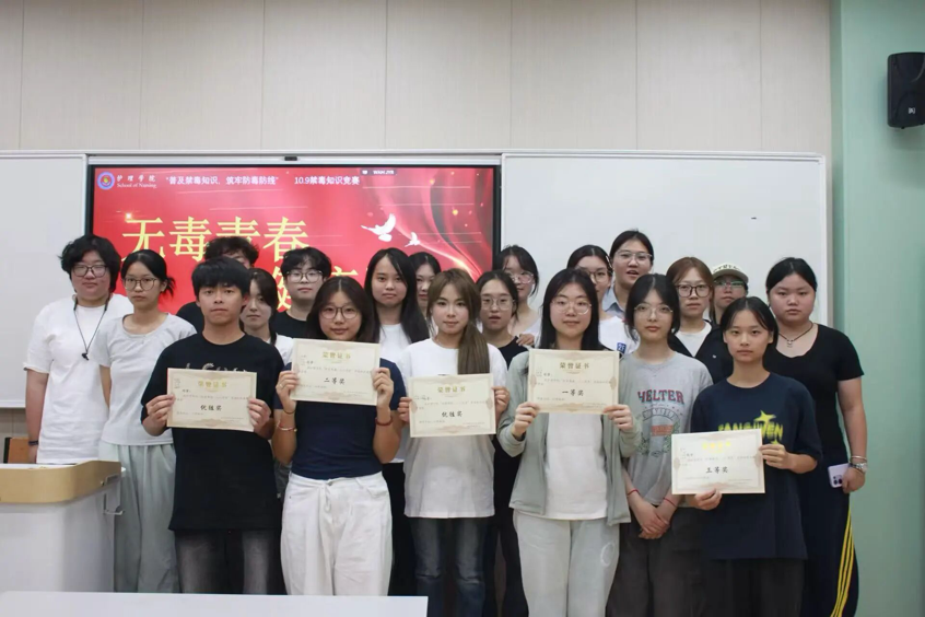 经过近两小时的激烈角逐,最终评选出一等奖:24护理单考单招2班、25护理4班二等奖:24护理4班、25护理(健康与社会照护五年制)2班三等奖:24护理单考单招4班、25护理(五年制)3班优胜奖:24护理2班、24护理单考单招5班、25护理单考单招2班、25护理1班礼仪队工作人员为获奖队伍依次颁发荣誉证书,并与选手们合影留念。主持人在结束语中肯定了全体参赛选手的优异表现,强调“禁毒知识的学习没有终点”,鼓励大家将比赛中掌握的知识传递给身边人,带动更多人参与到禁毒行动中。