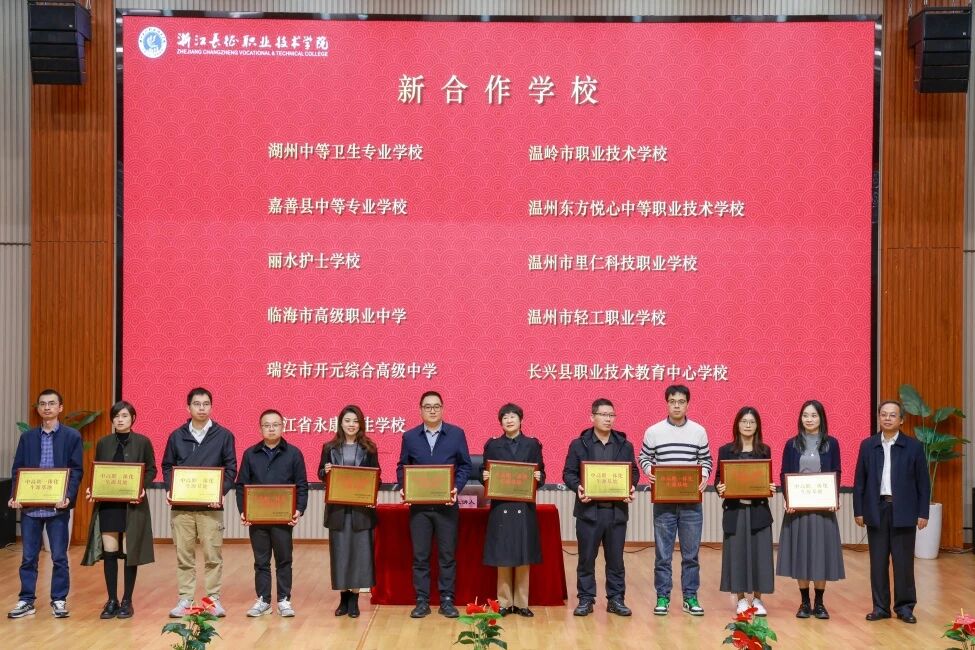 会上,学校为湖州中等卫生专业学校等 11 所新达成合作的中职学校授予 “中高职一体化生源基地” 称号。此次授牌标志着我校中高职合作网络进一步拓展,为优质生源输送、资源共享共建奠定了坚实基础,将推动一体化培养模式向更广范围、更深层次延伸。