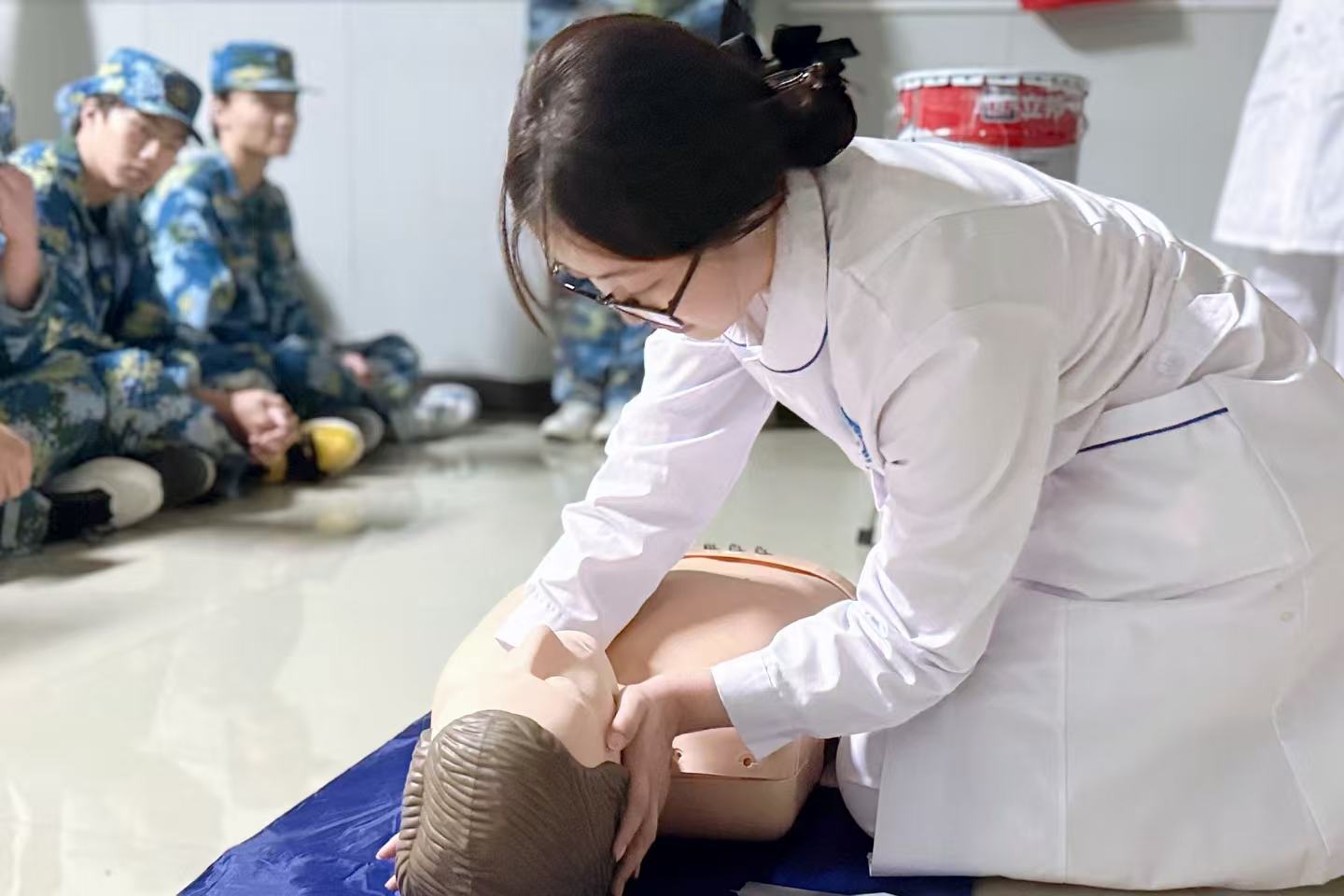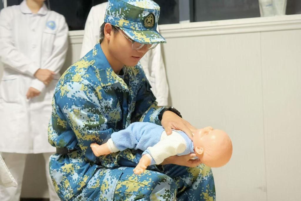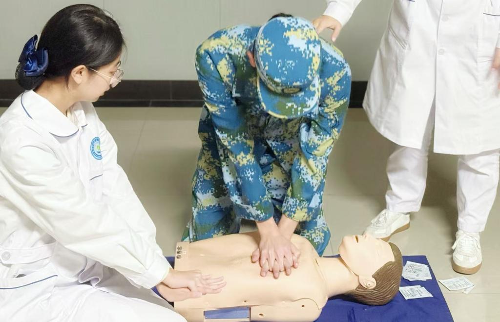 培训过程中,教官队成员展现出高度的责任感与学习热情。大家严格遵循讲师指导,分组开展实操训练,相互配合、相互纠错,反复打磨操作细节:在心肺复苏训练中,精准把握按压节奏与深度,规范完成通气动作;在伤口包扎练习中,熟练运用三角巾完成头部、肢体等不同部位的包扎操作;在海姆立克急救法实操中,准确掌握冲击位置与力度,确保动作规范有效。遇到疑问时,队员们主动向讲师请教,现场学习氛围浓厚,训练成效显著。
