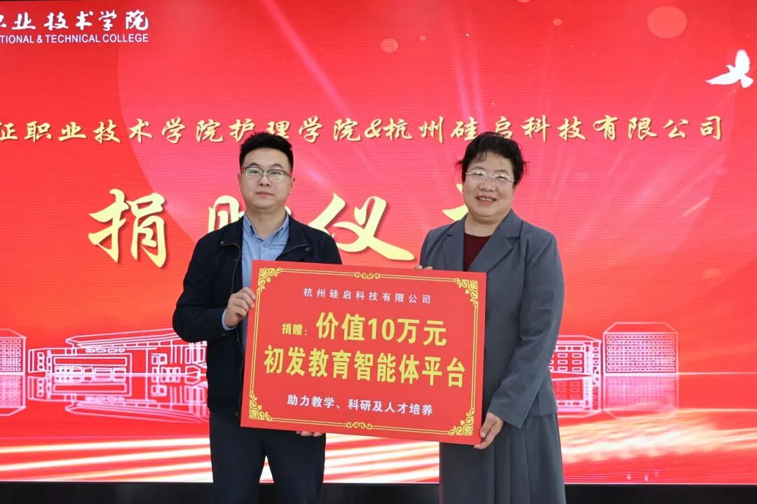 为深化产教融合、推动AI技术赋能护理教育,4月9日下午,护理学院与杭州硅启科技有限公司联合举办捐赠仪式暨“硅启杯”首届AI智能体创作大赛颁奖仪式。副校长冯新红、杭州硅启科技总经理郝朝阳及市场负责人丁宇、北京雁讯科技渠道总监朱波、护理学院院长祖淑梅、党总支书记张泱、副院长应佳盈等校企领导与师生代表共同出席,活动由护理学院教师杜娟主持。
