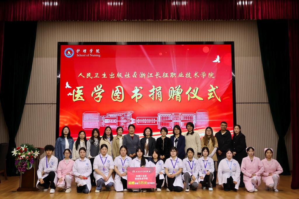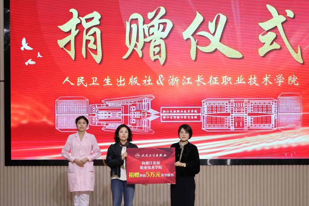 以书为媒促共建校企携手育人才。4月22日下午,人民卫生出版社向浙江长征职业技术学院捐赠医学图书仪式在学校第二报告厅举行。学校图书馆馆长李春辉,护理学院院长祖淑梅、副院长应佳盈,以及人民卫生出版社浙江经销服务中心、杭州仁医图书有限公司总经理孙青等校企双方代表共同出席,护理学院师生代表参加活动,现场气氛庄重而热烈。