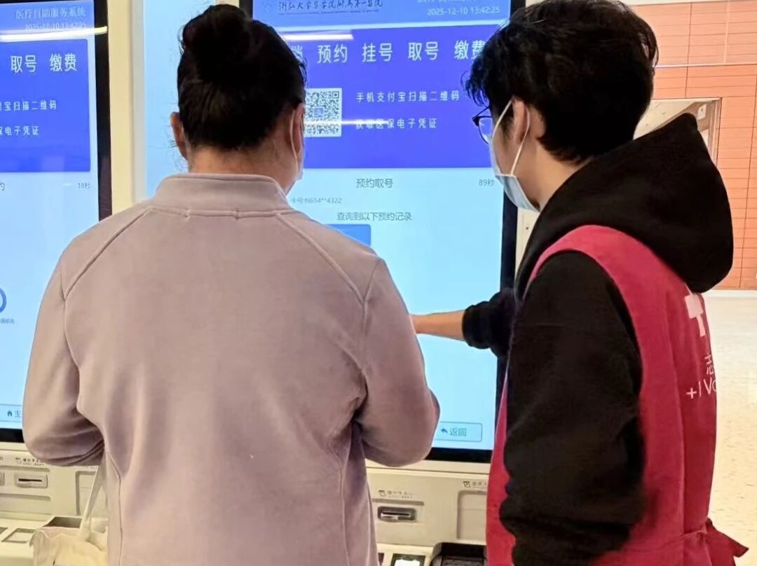 而让我感受最深的,是在浙江大学医学院附属第一医院的志愿服务。在医院里,我看到了患者和家属的焦虑与无助。我协助他们使用自助挂号机、指引科室位置、安抚他们的情绪。医院的环境更加复杂,对耐心和同理心的要求也更高,这让我学会了在压力下保持温暖,用行动为他人带去一份安心。