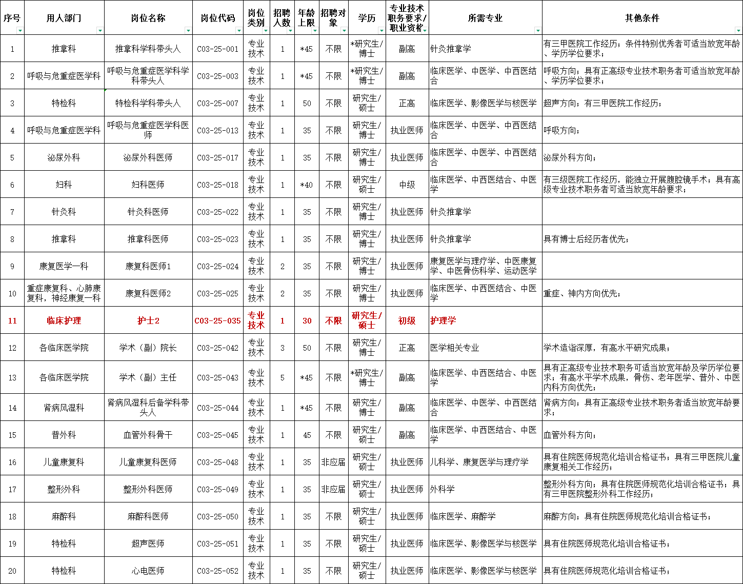 根据省人力社保厅《浙江省省属事业单位2025年特殊专业技术岗位招聘信息》,结合浙江中医药大学附属第三医院2025年招聘方案及计划,2025年下半年,我院29个岗位列入特岗目录,计划招聘45人,面向社会公开招聘,具体招聘岗位、人数和资格条件详见招聘岗位表(附件1、附件2),招聘工作相关补充说明及安排如下: