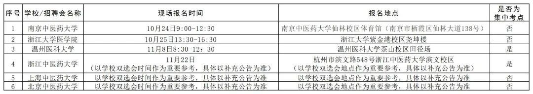 注:以上为截至目前的最新双选会信息,若有变动将以补充通知形式告知。非集中考点现场报名学校双选会时间以在9月30日至 11月22日期间为准,超出该时间范畴则取消相关非集中考点场次。