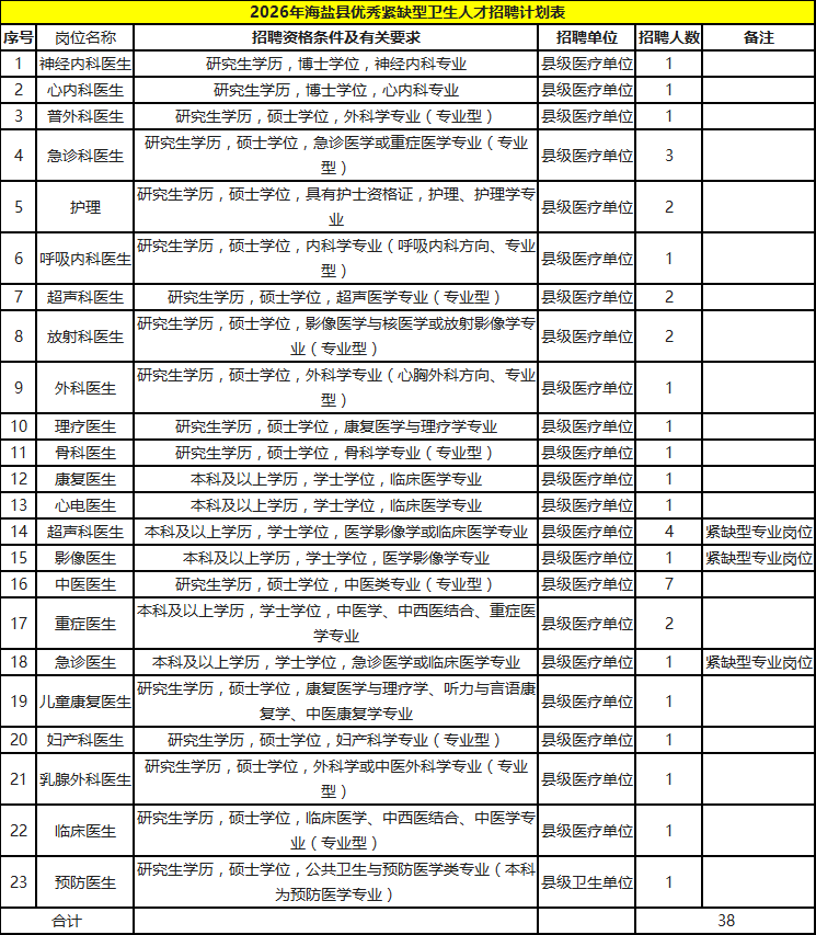 2026年嘉兴海盐县卫生健康系统招聘优秀、紧缺型卫技人才38人公告