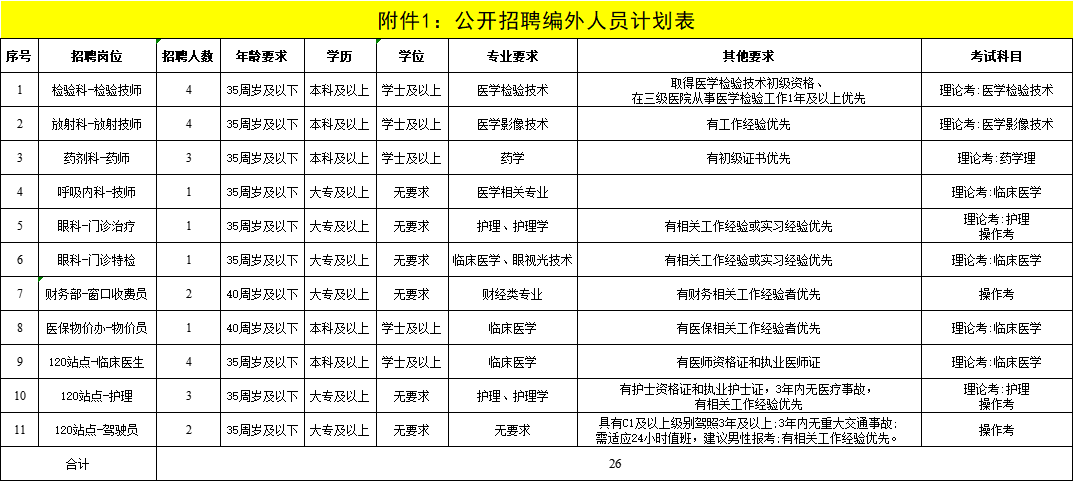 本次计划招聘编外人员26名。具体招聘岗位、人数、条件及其他要求详见附件1《浙江省人民医院富阳院区公开招聘编外人员计划表》(以下简称《招聘计划表》)。
