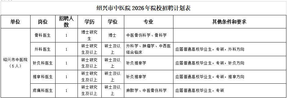 绍兴市本级卫生健康单位现场招聘医学类毕业生5名(博士1名、硕士4名),为事业编制报备员额管理,具体招聘岗位、人数、专业、其他条件和要求详见文末。