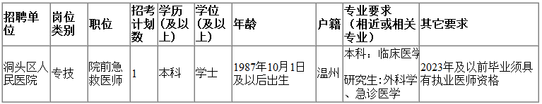 为加强我区医疗卫生单位人才建设,因岗位紧缺,根据中共中央组织部、人力资源社会保障部《关于进一步做好事业单位公开招聘工作的通知》(人社部发〔2024〕57号),《关于进一步规范机关事业单位和国有企业公开招录(招聘)管理工作的通知》(洞组发〔2022〕26号),《关于进一步规范卫生健康系统卫技人员公开招聘工作的意见》(洞卫发〔2020〕16号)等相关文件精神,经研究,洞头区人民医院面向社会公开招聘院前急救医师1名。现将有关事项公告如下: