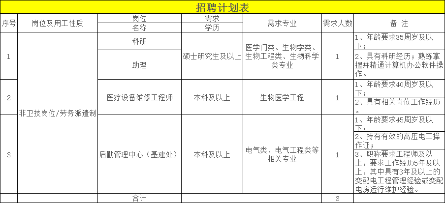 根据医院发展需要,经研究,舟山医院现面向社会公开招聘编外人员3名。目前舟山医院编外人员中卫技岗位的月工资奖金等已实行同工同酬管理。具体招聘事项公告如下: