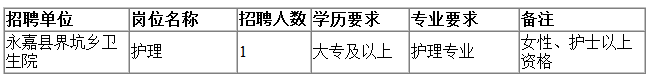 因工作需要,经县卫生健康局同意,永嘉县界坑乡卫生院面向社会公开招聘劳务派遣人员1名。现将有关事项公告如下: