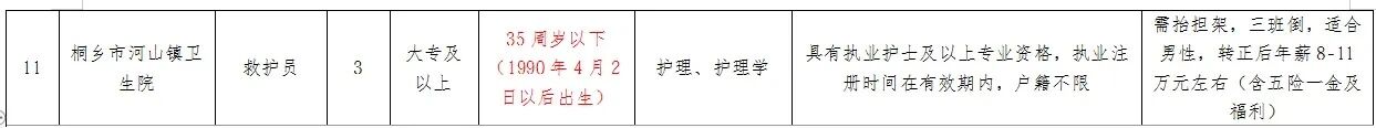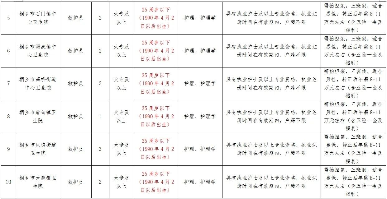 因桐乡市第一人民医院、桐乡市第二人民医院、桐乡市中医医院、桐乡市第三人民医院、桐乡市石门镇中心卫生院、桐乡市洲泉镇中心卫生院、桐乡市高桥街道中心卫生院、桐乡市屠甸镇卫生院、桐乡市凤鸣街道卫生院、桐乡市大麻镇卫生院、桐乡市河山镇卫生院有招聘救护员的需求,现桐乡市桐卫人力资源服务有限公司面向社会公开招聘工作人员,采用购买服务的方式派遣至上述单位工作,有关事项公告如下: