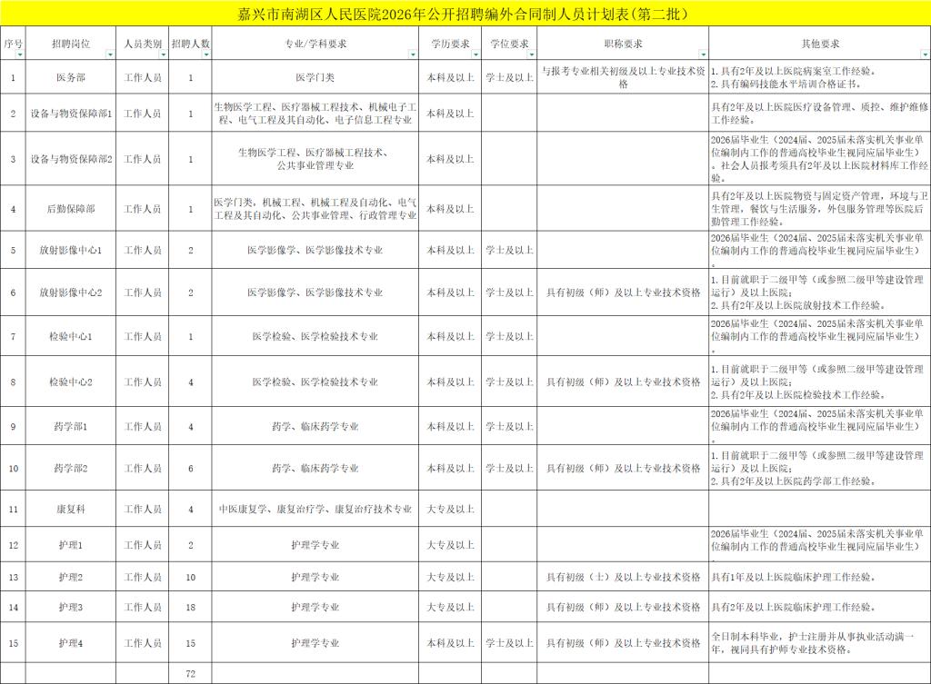 嘉兴市南湖区人民医院计划招聘编外合同制工作人员72名,涉及15个岗位。具体招聘岗位、人数和资格条件详见《招聘计划表》(附件1)。