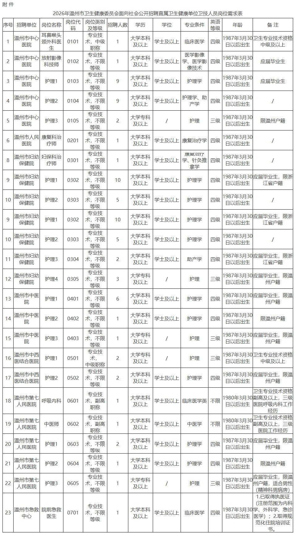 (一)用人单位、具体岗位及要求详见《2026年温州市卫生健康委员会面向社会公开招聘直属卫生健康单位卫技人员岗位需求表》(附件)。